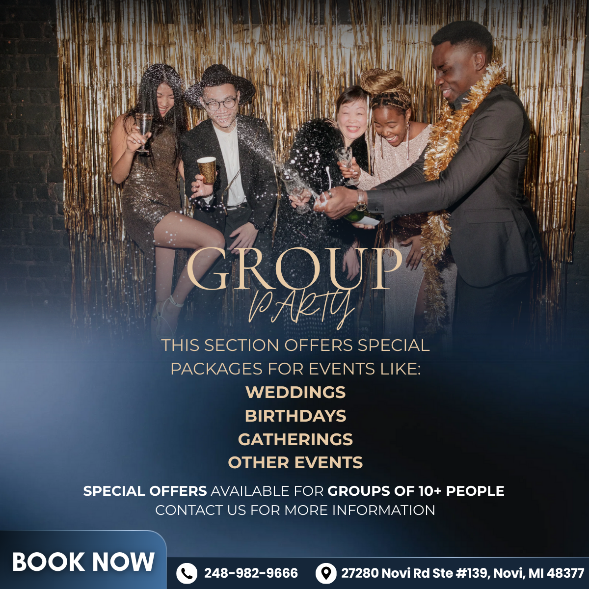 Our Salon is the perfect place to host a bridal shower, birthday celebration, bachelorette/bachelor party, corporate event or a just a get-together for friends, family, and co-workers. We have a beautiful and accommodating space, affordable prices to fit everyone's budget, and a large team of technicians to serve your needs so you and your guests can relax and enjoy the party. Please inquire for details by giving us a call at 248-982-9666 or fill out the form. We will provide many complimentary items such as cake, finger food, drinks & snacks. This is your place for fun, excitement and nail services.